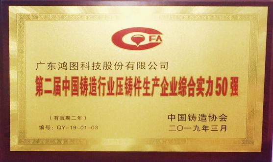 At this annual meeting, the members of the top 50evaluation team of die-casting enterprises evaluated the performance ofGuangdong Hongtu, basic management and human resources, independent innovation,social responsibility and industry influence, and participation in associationactivities. The company has no suspense. Once again, it has won the honorarytitle of “Top 50 Comprehensive Strength of China's Die Casting ProductionEnterprises” and is in the forefront of the domestic die-casting enterpriserankings. This is the national industry association's full recognition of thecompany's contribution to the development of the industry and its prominentposition in the industry. The embodiment and the important imprint of thecompany's development process.