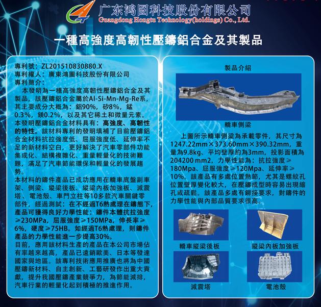 张国光副总经理获奖后接受媒体采访表示,该专利技术已成功应用于轿车底盘副车架、侧梁、纵梁后板、纵梁内板加强板、减震塔、电池壳、车门立柱等10多款汽车关键零部件的开发和生产,填补了国内铝合金压铸新材料长期受控于国外的空白。目前应用该材料生产的产品市场占有率越来越高,产品已远销欧美、日本等发达国家与地区。