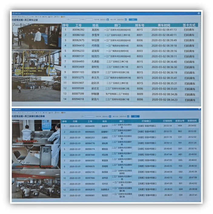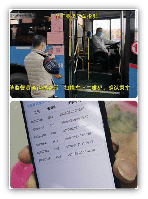 复工复产后,如何对员工的乘车和就餐过程进行精确追踪是疫情防控工作的难点。对此,信息化团队协同行政部、品质部,在现有人事一卡通系统平台上,开发了二维码信息对接系统,该系统可自动对接班车、打饭窗口、就餐座位等的信息。经过紧张的内部功能测试和程序优化,该系统在复工前已正式投入使用。截至目前,系统已累计产生数据68000多条,随着复工人数的增加,数据将不断被记录和分析,为全面有序复工打好基础。