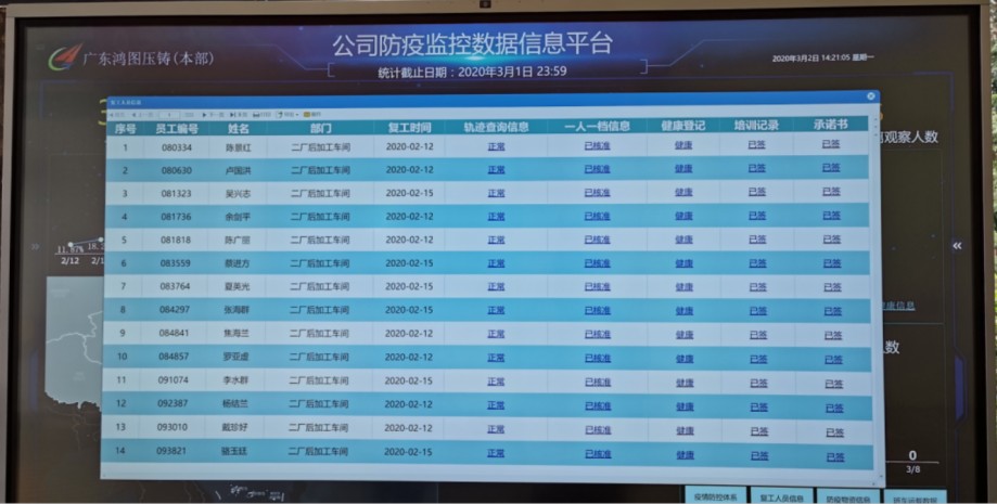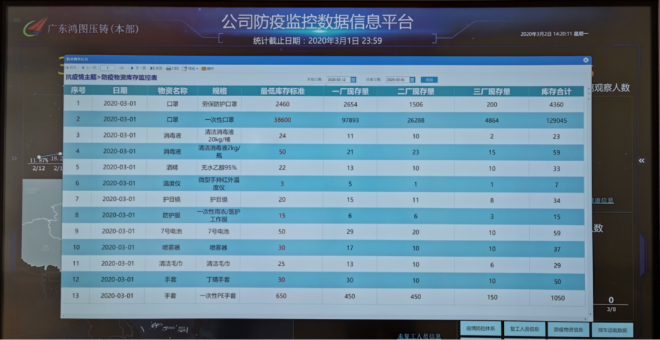 生产控制部信息化团队充分发挥信息化的赋智赋能效用,与公司防控一线的各部门同力协契、共克时艰,在原大数据信息平台基础上迅速构建了一套疫情防控信息化系统,组建了集网络会议、人员健康信息填报、复工人员档案跟踪、乘车管控记录、就餐管控记录、外来人员管控记录、防疫物资管控记录等功能在内的一体化数据监控管理平台。